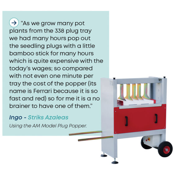 Machine for the expulsion of the young plants from their tray. Thanks to the electric system which adjust the heights of the pins, the eject operation is carried out gradually, reducing considerably any damage at plant root. The ease of tray insertion makes EPE extremely practical. Changing EPE plate (PE) enables the machine to work with several types of trays (max size 600x400x100 mm).