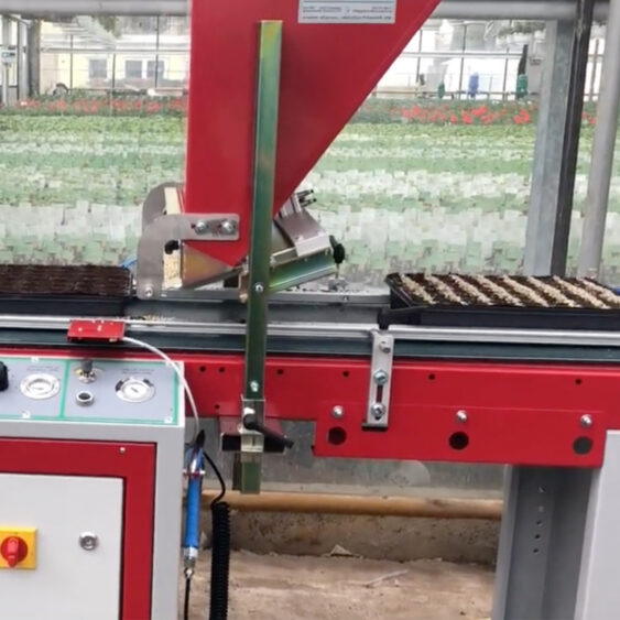 Seed is held in a hopper and evenly applied across the tray via a rotating drum. Both seed quantity and sowing speed can be easily adjusted using the touchscreen control panel, allowing growers to fine-tune output according to crop type and tray format.