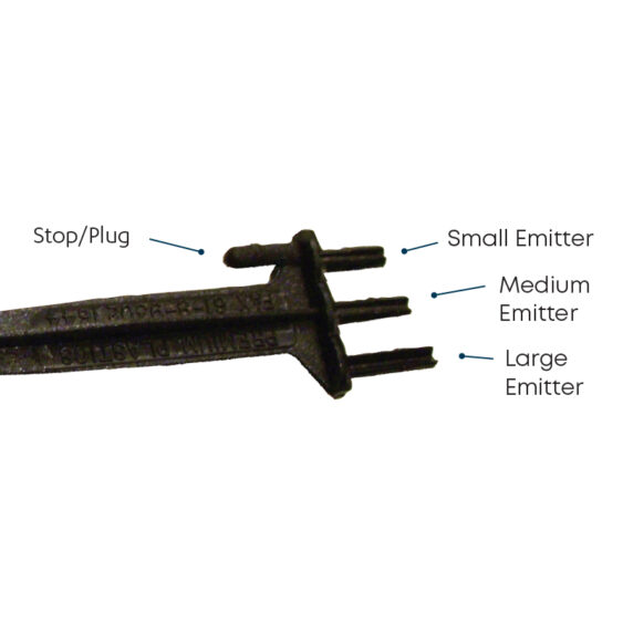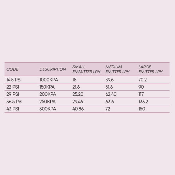 • Provides 3 emitters in one product to allow for different flow rate requirments. Flow rates at 206KPA are 48LPH for the small emitter, 90LPH for the medium and 120LPH for the Large.