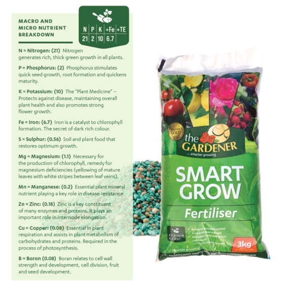 The Gardener SmartGrow Fertiliser is a balanced plant feed enriched with trace elements and high iron.