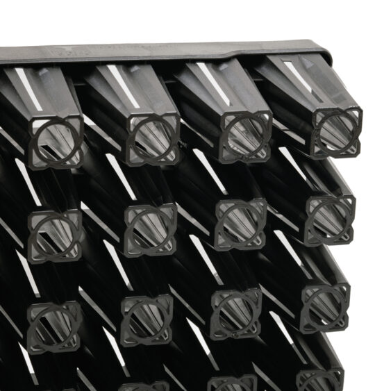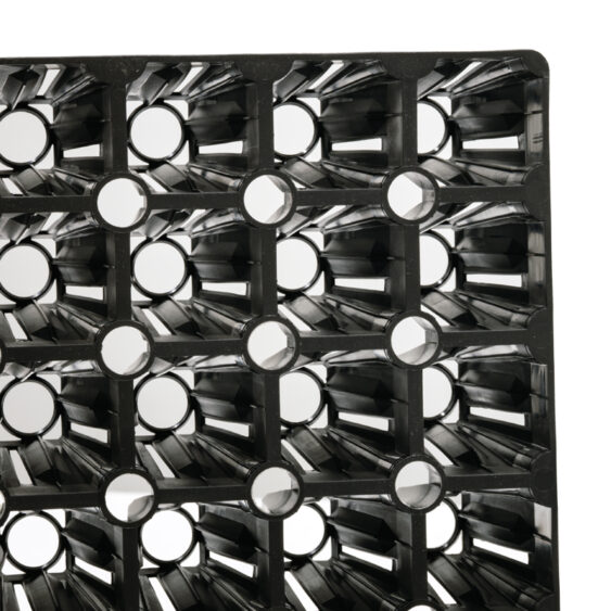 • Square formed root mass with 4 lower protrusions to minimise root spiralling around internal lower lip of the cell, encourages developing roots to break away to seek nutrients and ground moisture